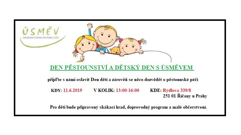 Poradenské centrum pro rodinu a děti - "ÚSMĚV", z.s. v rámci programu "Týden pěstounství Středočeského kraje 2019" zve všechny zájemce dne 11. června 2019 od 13.00 do 16.00 hodin na "Týden pěstounství a dětský den s Úsměvem".